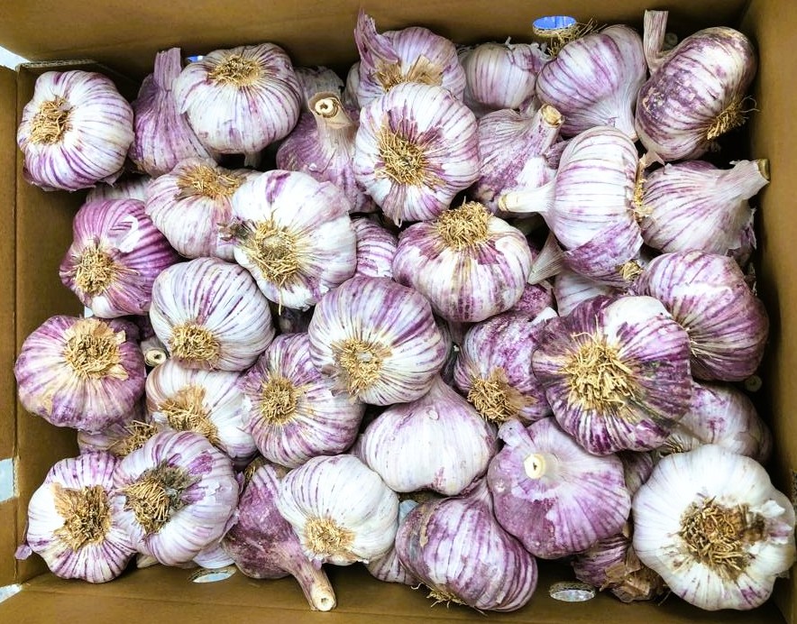 Our best seller is the purple Morado garlic, known for its intense, spicy flavor. It is white on the outside, with the individual cloves being wrapped in a beautiful wine-red or purplish-brown skin. It is a prized hard-neck type, appreciated for its robust taste, high allicin content, and long storage life.